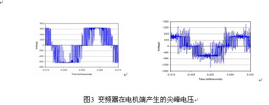 3、變頻器損傷電機(jī)定子繞組的機(jī)理 脈沖電壓在電纜上傳輸時(shí),如果電纜的電抗器阻抗與負(fù)載的阻抗不匹配,在負(fù)載端會(huì)產(chǎn)生反射。反射的結(jié)果是,入射波與反射波疊加,形成更高的電壓,它的幅度最大可以達(dá)到直流母線電壓的2倍,大約相當(dāng)于變頻器輸入電壓的3倍,如圖3所示。過高的尖峰電壓加在電機(jī)定子的電抗器上,對(duì)線圈造成電壓沖擊,頻繁的過電壓沖擊會(huì)導(dǎo)致電機(jī)過早失效。