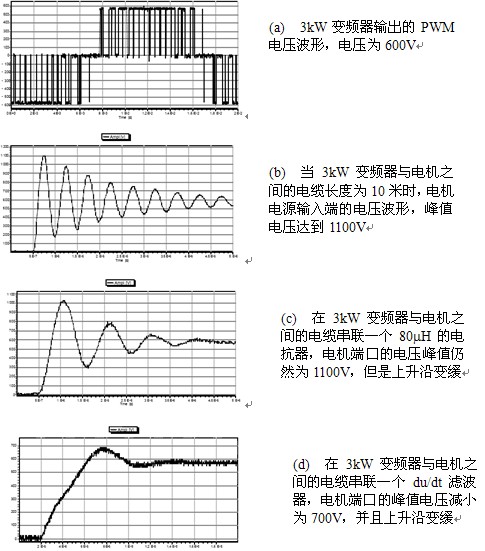 2)在變頻器的輸出端安裝dv/dt濾波器:這個(gè)措施適用于電纜長(zhǎng)度小于300米的場(chǎng)合,價(jià)格略高于電抗器,但是效果有了明顯的改善,如圖6(d)所示。